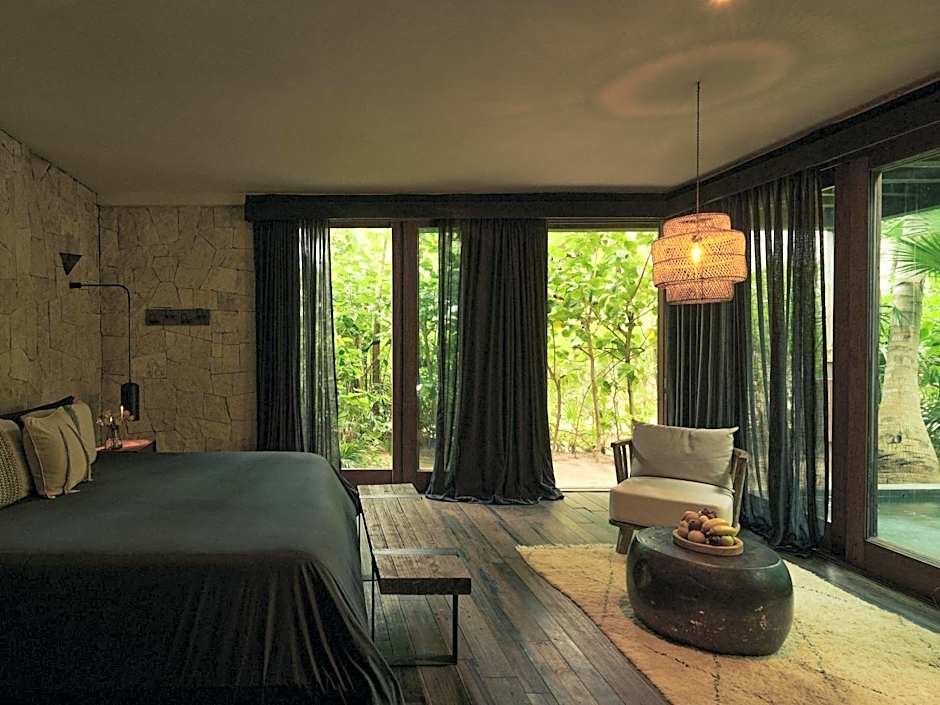 Suite surrounded by lush gardens. This suite features an outdoor pool, large bedroom, a fully furnished living room, kitchen and dining room. A private bath, linens, air conditioner, safety deposit box, bath robes, i-pod dock and complimentary Wi-Fi round up the amenities for this suite.